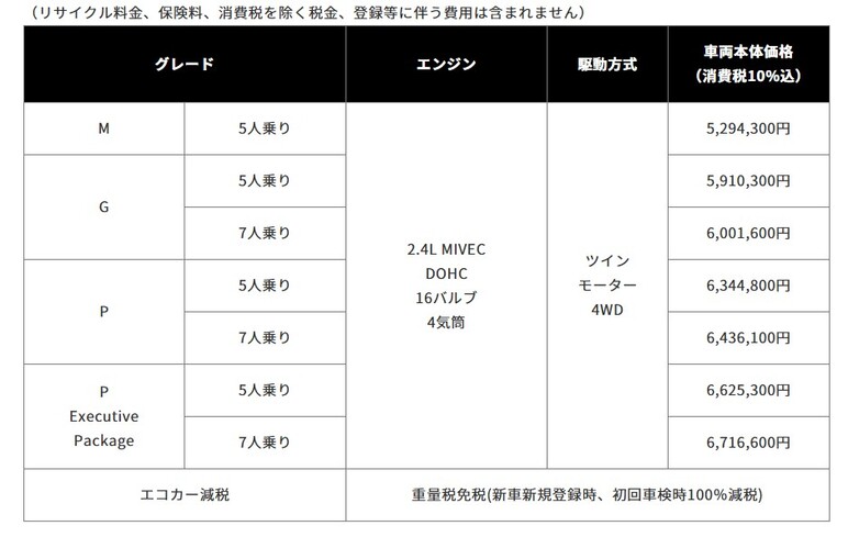 アウトランダーPHEVの価格は以下の通り。※価格は全グレードで3万800円の上昇。
