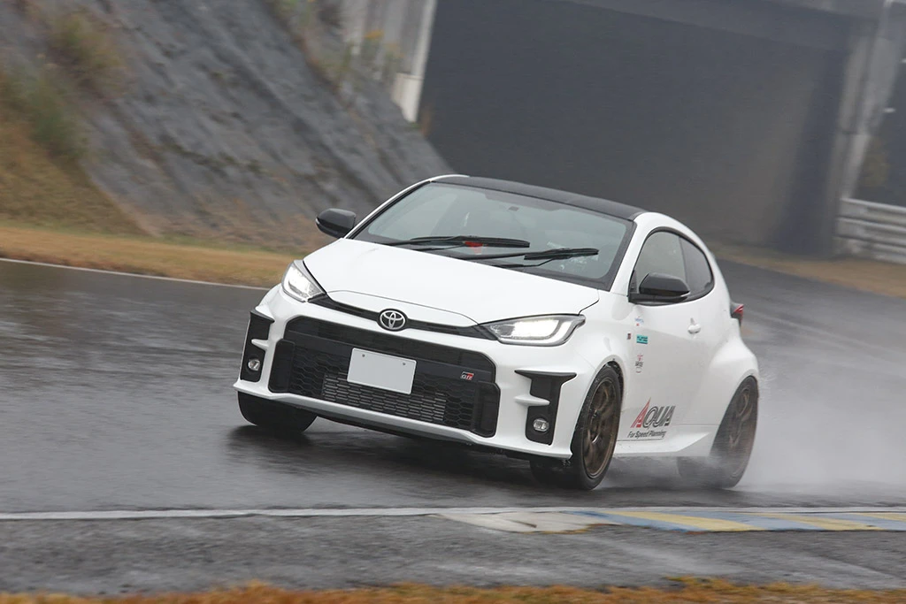 試乗を行ったレーシングドライバーの井入宏之選手は「GRヤリスに乗るのは今回が初めてだったんだけど、ブーストアップ済みと言われても信じてしまうほどのパンチがあった。足回りはニュートラルステアに近い状態で限界を超えた際のコントロール性も素直。これだけのヘビーウエットでもトラクションがしっかりかけられたよ。今後の煮詰めが楽しみな一台やね!」と評価。