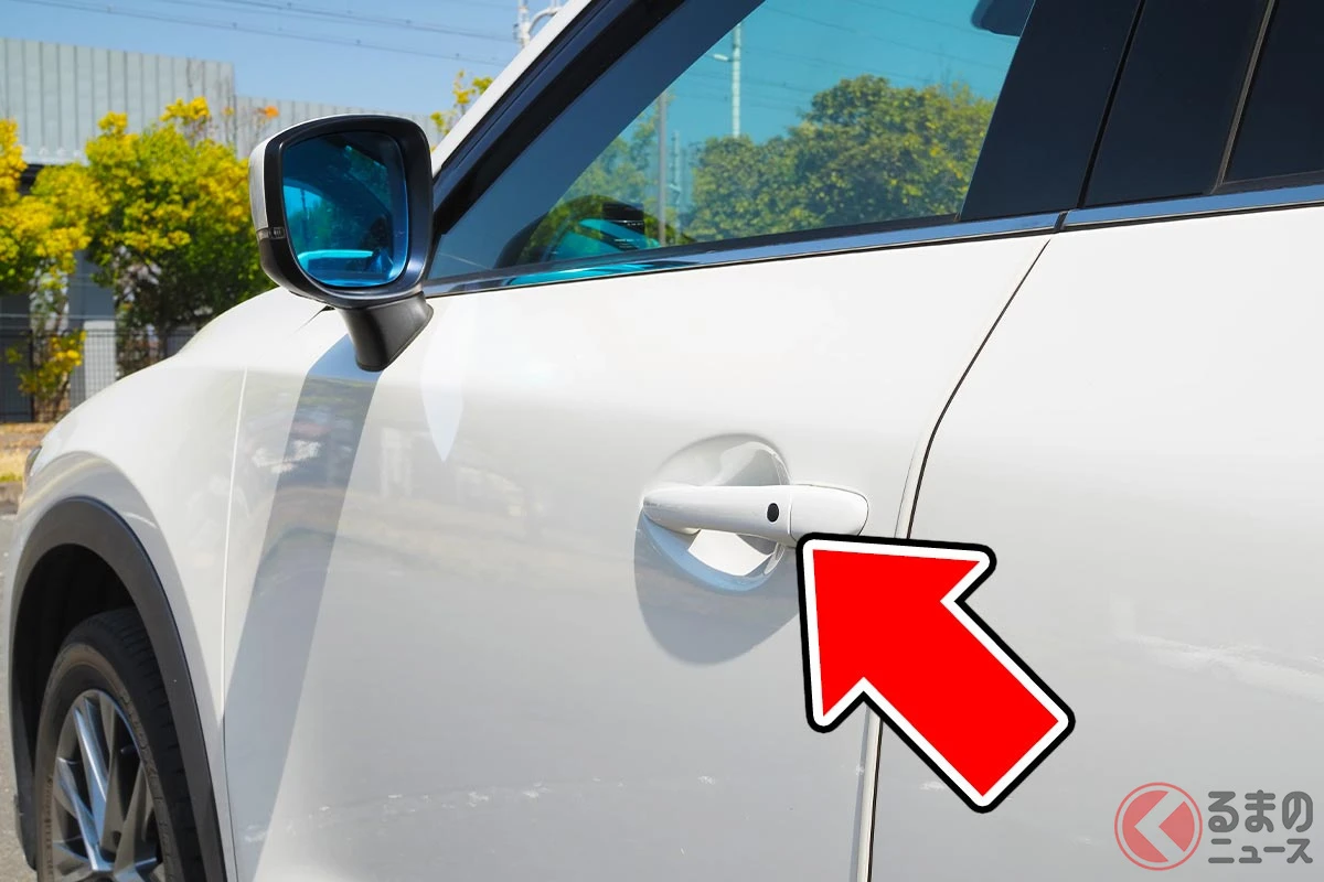 クルマのドアハンドルをよく見ると、まるでホクロのような「黒いボタン」が埋め込まれていたり、あるいは「三本の線」が刻まれていたりします。